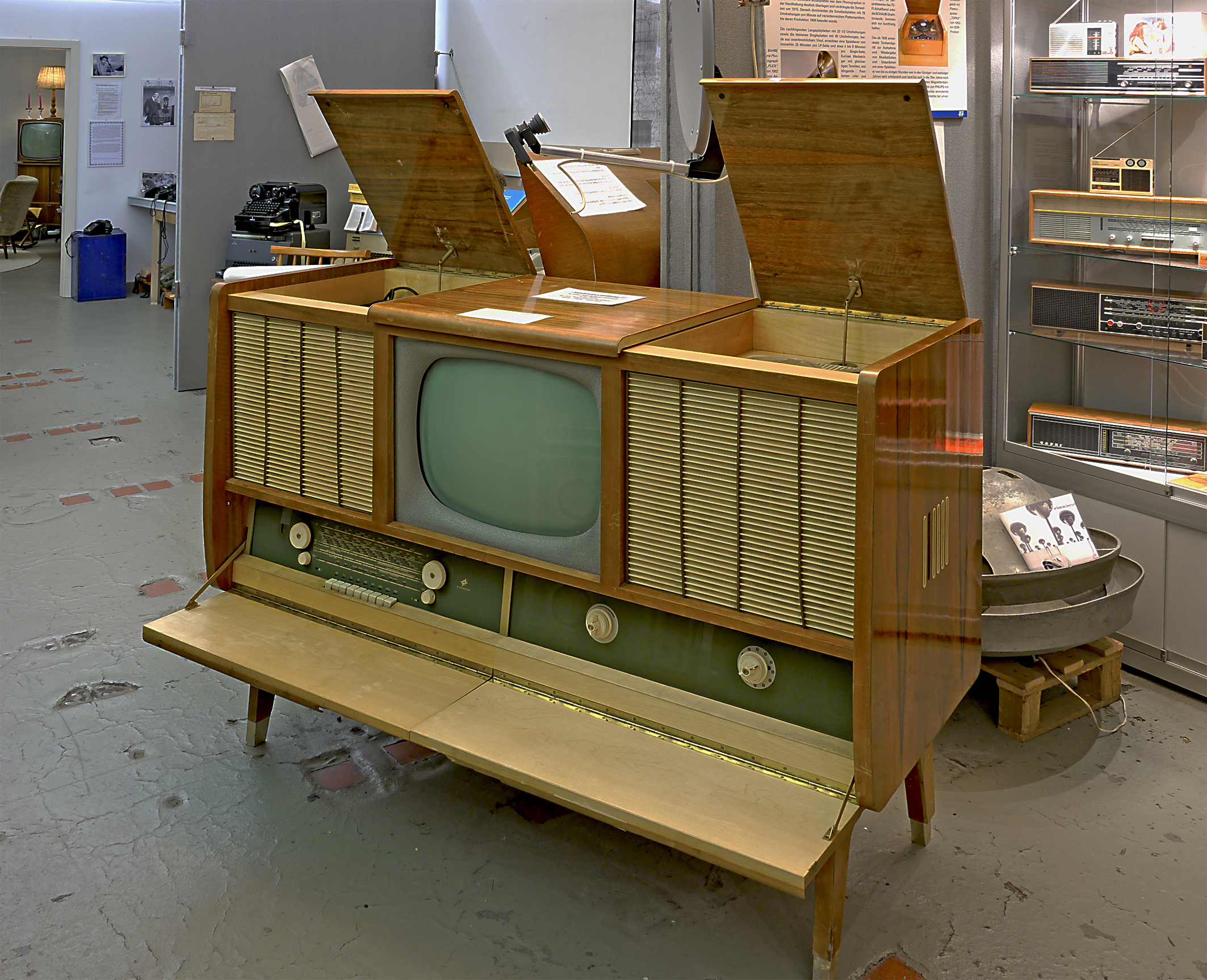 Die riesige Fernseh- Phono-Truhe von 1957/58 ist ein richtiger Hingucker. 160 kg wiegt die Truhe mit eingebautem Fernsehgerät, Radio, Tonbandgerät und Plattenspieler. Preis: 6.850 Mark Ost.