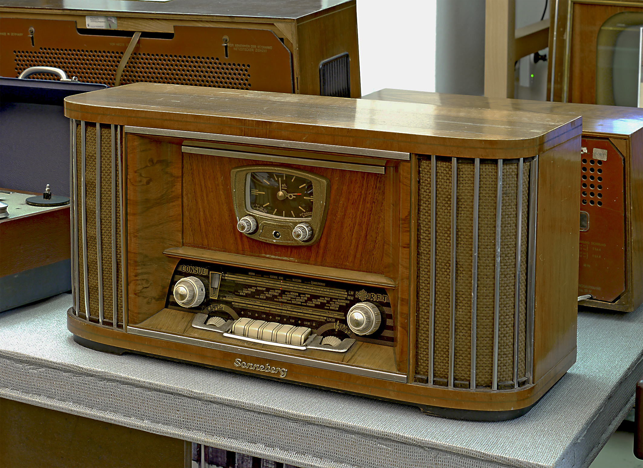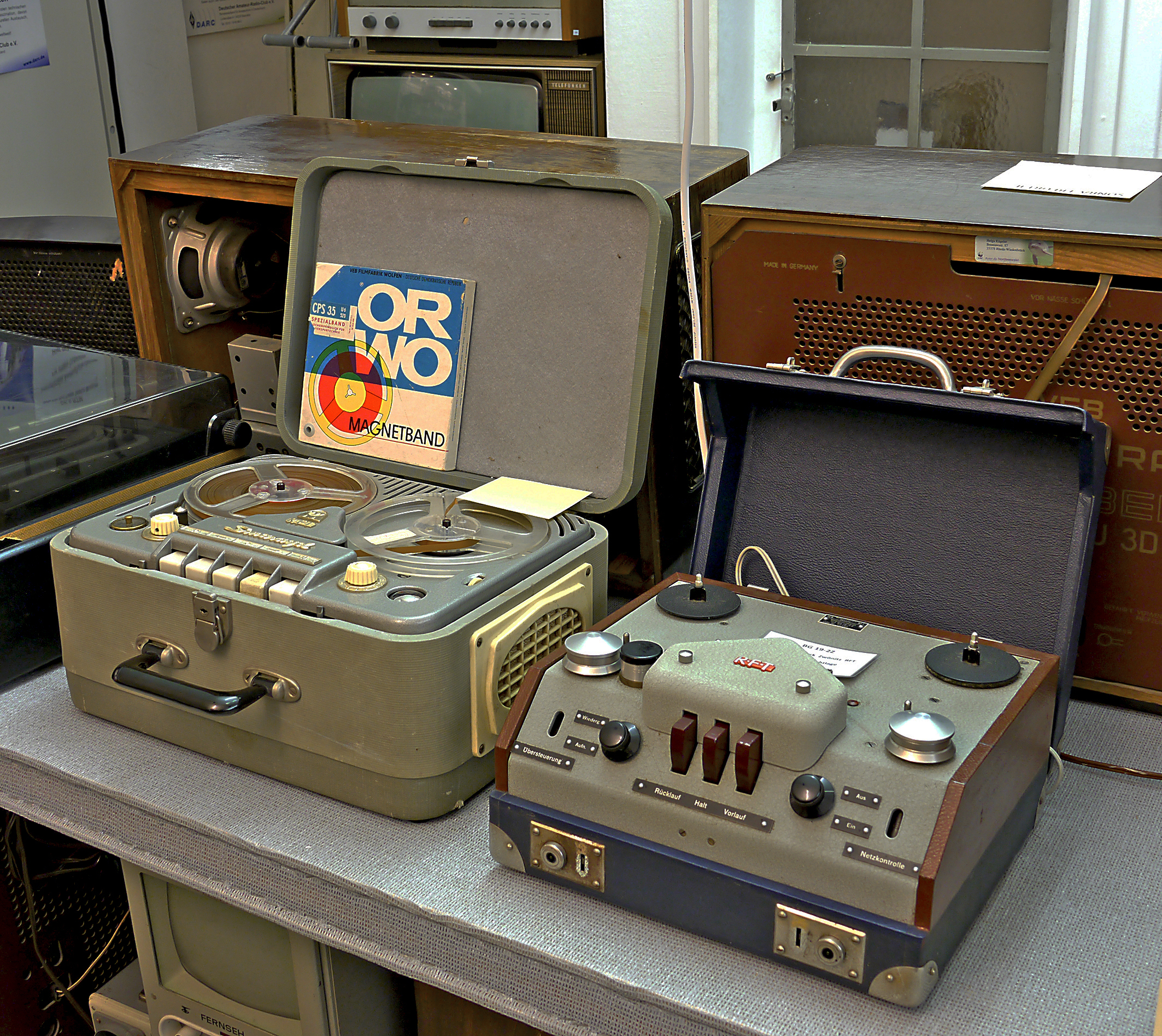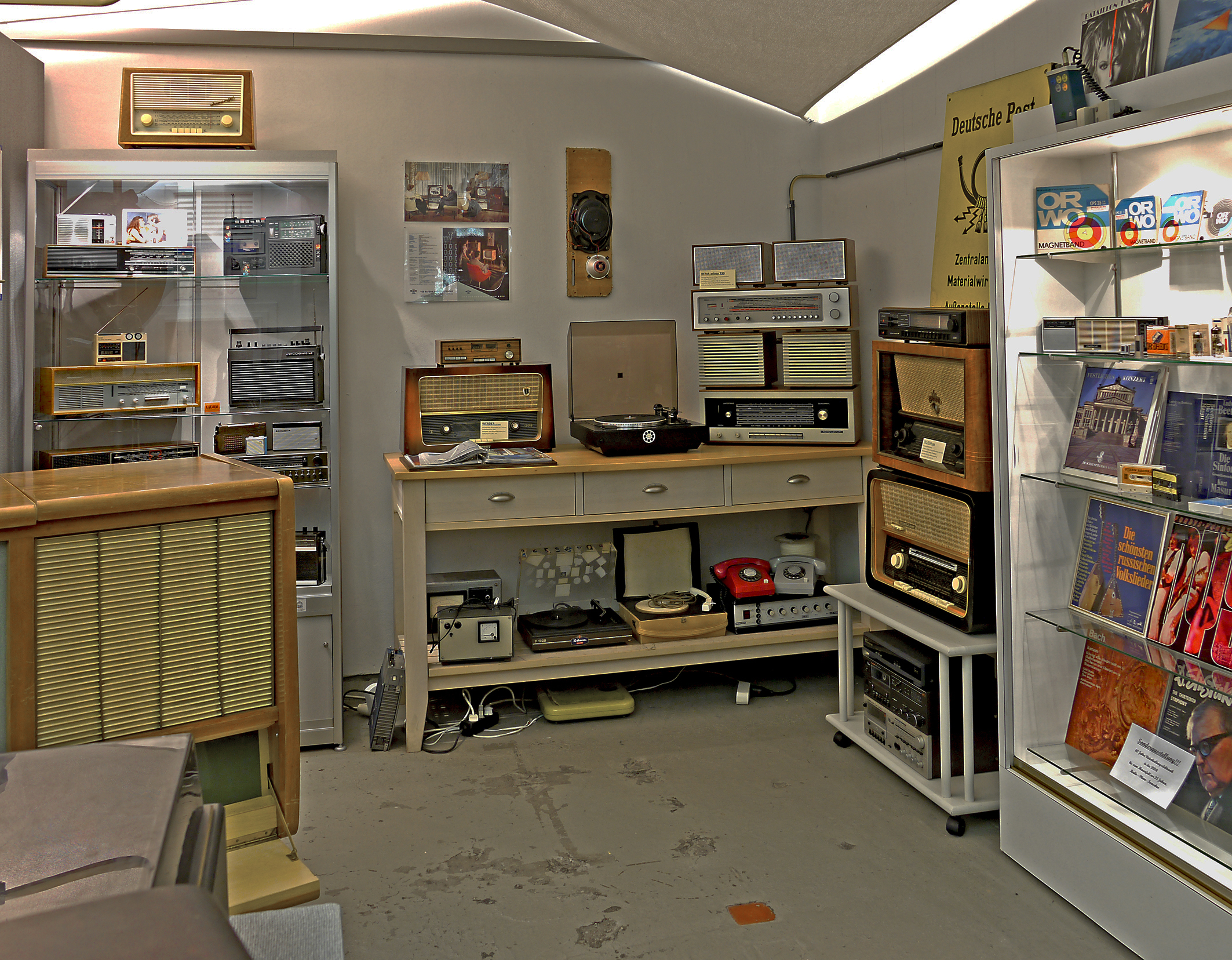 Zur Reichs-Rundfunk-Gesellschaft ist ein seltener Volksemfänger im Holzgehäuse für 110 Volt Gleichstrom-Netze zu sehen und eine Mikrofon-Kapsel von dem berühmten Neumann Flasche. Sogenannt wegen des Aussehens. Ebenso sind Schallplatten mit Aufnahmen aus der Zeit des 2. Weltkrieges zu sehen und hören, mit einem Tisch-Grammophon.