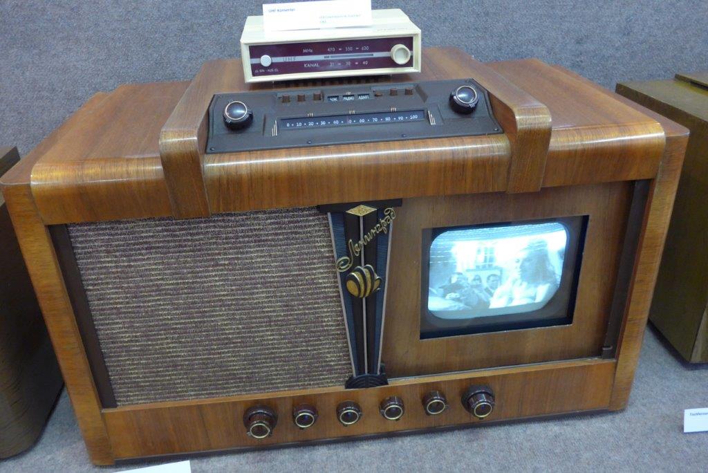 Ein toller Querschnitt von Fernsehgeräten mit einer Bildröhre. Auch die Vorerfinder der mechanischen Bildübertragung mit einer Lochscheibe nach dem System von Paul Nipkow sind hier zu sehen.