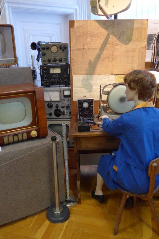 Fernsehbauteile und Schriften in den Vitrinen ergänzen die Ausstellung. Ebenso die Plakate an den Wänden sind sehenswert.